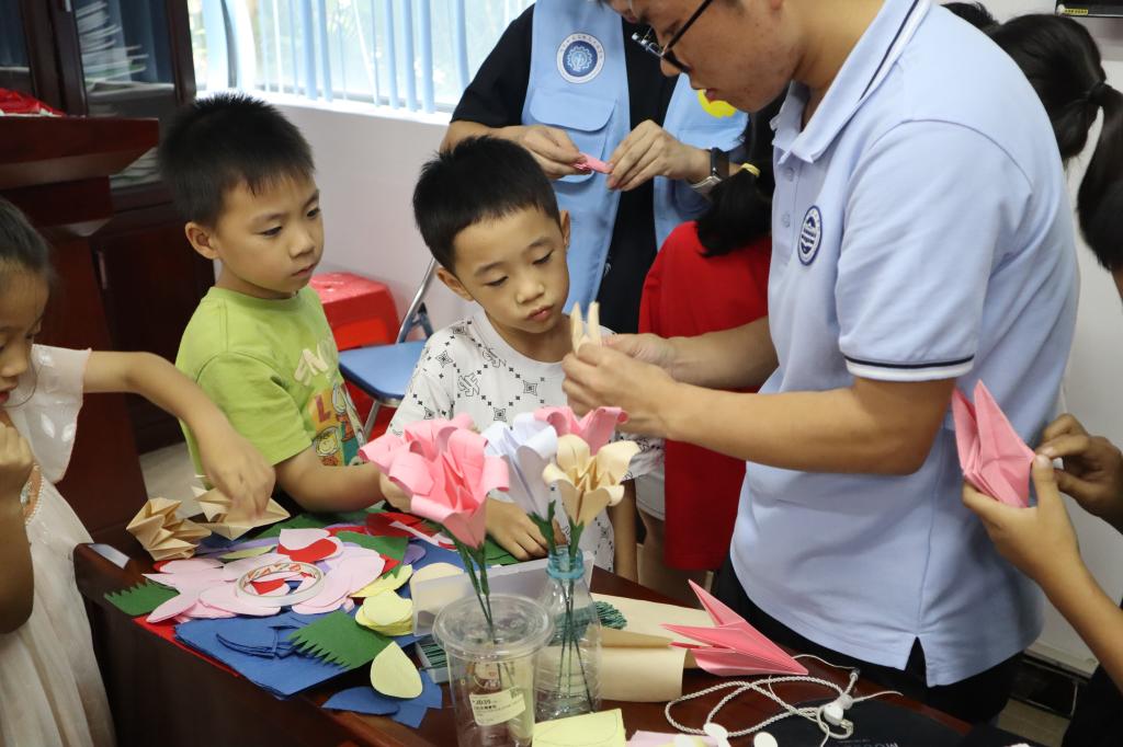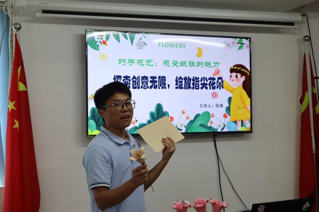 下午,广理 “童心启航” 社会实践队在新塘新世界社区开展了 “巧手折花艺,指尖绽繁花” 折纸花创作活动。大家围坐在一起,用一张张彩纸勾勒出花草的灵动,让平凡的纸张在指尖焕发别样生机。课堂开始,张康老师先给大家展示了自己的折纸花作品,有花瓣层层舒展的月季,有带着露珠般娇憨的铃兰,还有花瓣边缘带着波浪纹的康乃馨。老师边展示边讲解,还特意带来了不同年代的折纸图谱照片,从简单的几何造型到复杂的花卉纹样,让大家直观感受到折纸艺术的传承与演变。孩子们瞪大眼睛凑近看,小声讨论着 “这个花瓣怎么折出来的”,满是好奇与期待。随后到了实操环节,桌上整齐摆着红、黄、粉、紫等各色彩纸,还有用来做花茎的细竹签和装饰用的绿色皱纹纸。张康老师一步步分解步骤:“先把纸沿中线对折成正方形,再像折小扇子那样折出褶皱……” 小朋友都跟着步骤慢慢折,手指捏着纸边反复调整角度,在其他的队伍同学的帮助下,小朋友们都出色的完成了属于自己的折纸花。此次折纸花活动,不仅让大家在折折剪剪中学会了基础的折纸技巧,更在动手过程中体会到创意表达的乐趣。