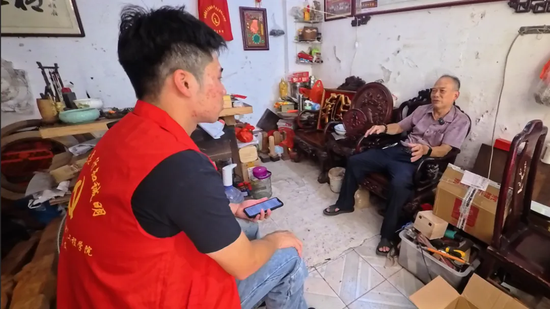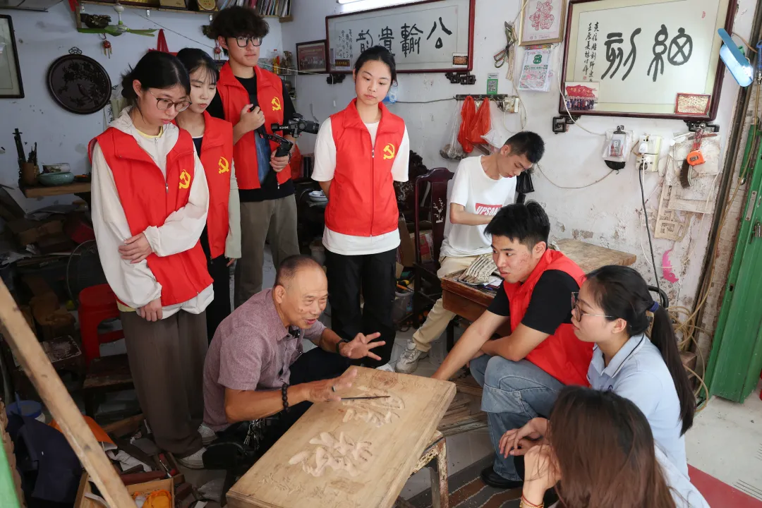 在木雕坊中,实践队队员对姚师傅进行了专访。大家带着对潮阳木雕的好奇与敬意,向姚师傅的艺术生涯、创作心得以及对非遗传承的思考进行深入了解。
